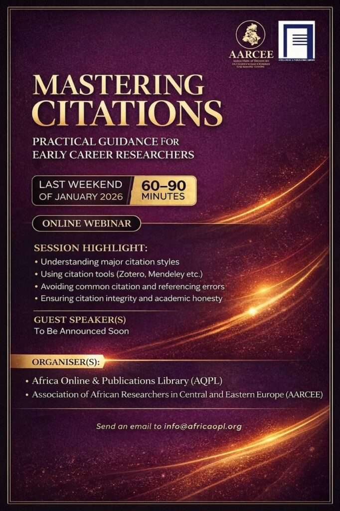 To respond to this need, AOPL is partnering with the Association of African Researchers in Central and Eastern Europe (AARCEE) to host a focused online webinar titled Mastering Citations: Practical Guidance for Early Career Researchers, taking place during the last weekend of January 2026.